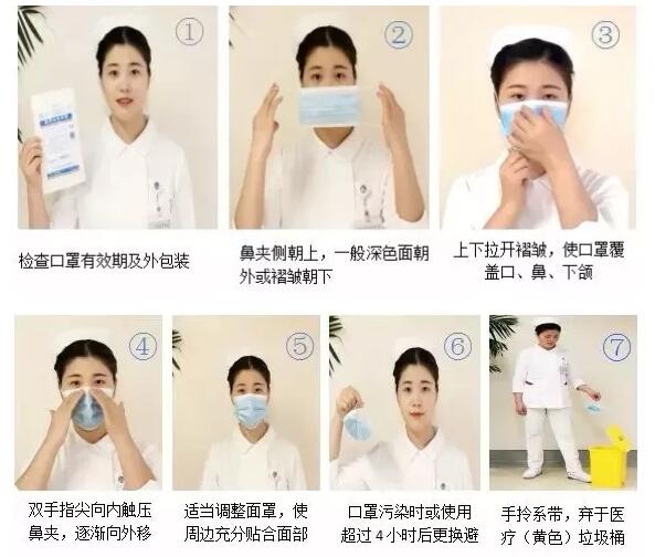 醫(yī)用外科口罩有三層,從外到內(nèi)分別是防水層、過濾層、舒適層。舒適層是一層無紡布,佩戴時(shí)白色的無紡布朝內(nèi),藍(lán)色的防水層朝外,有金屬片的一邊朝上,不要戴反,橡皮筋掛上雙耳后捏緊金屬片和鼻子貼合,撫平兩頰,使口罩和面部之間盡量不留縫隙。